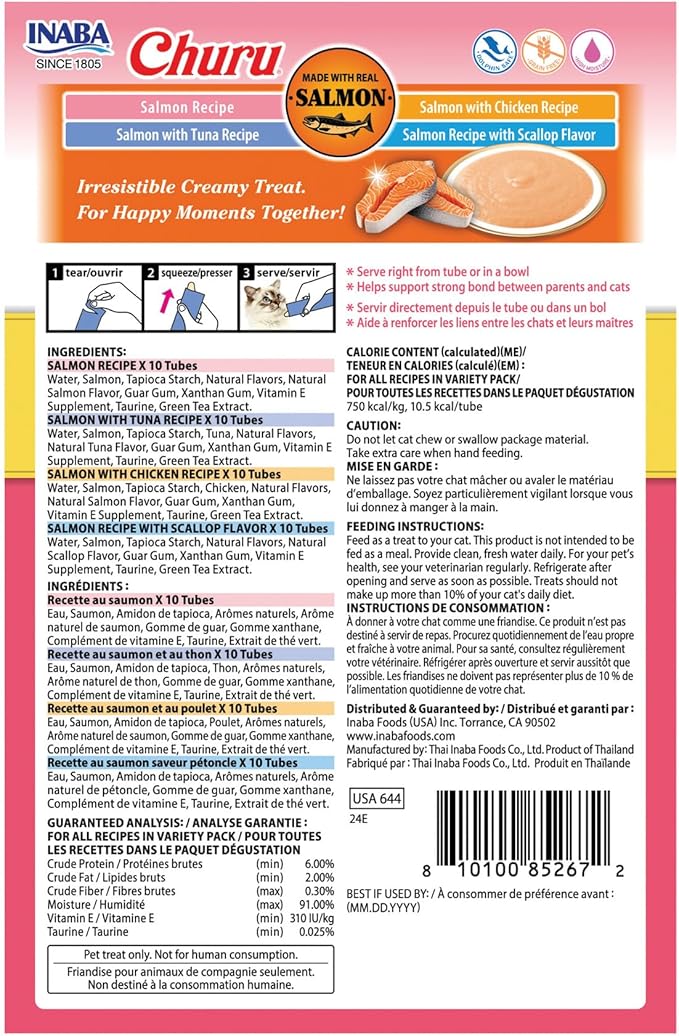 INABA Salmon Churu Cat Treats, Lickable, Squeezable Creamy Purée Cat Treat with Green Tea Extract & Taurine, 0.5 Ounces Each Tube, 40 Tubes, Salmon Variety Box