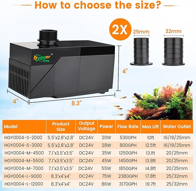 - hygger Aquarium Pump: The 75W water pump made of excellent material; pure copper motor and wear-resistant ceramic shaft ensures ultra-quiet operation and long service life.Voltage is 110-120V/60Hz; Flow Rate is 2380GPH; Headlift is 17.8Ft.Suitable for use in freshwater and saltwater aquariums.