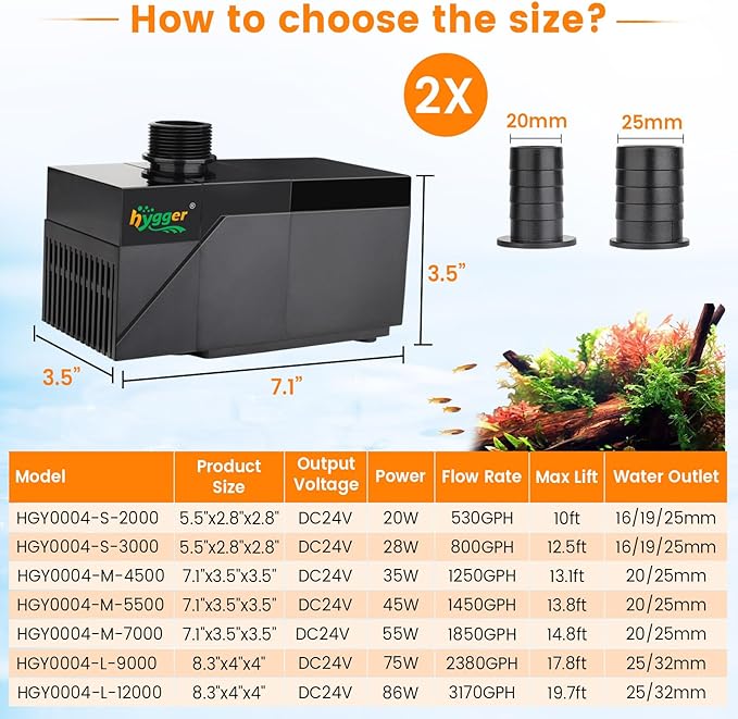 - hygger Aquarium Pump: The 35W water pump made of excellent material; pure copper motor and wear-resistant ceramic shaft ensures ultra-quiet operation and long service life.Voltage is 110-120V/60Hz; Flow Rate is 1250GPH; Headlift is 13.1Ft.Suitable for use in freshwater and saltwater aquariums.