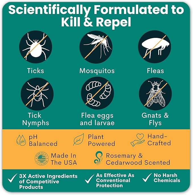 - ✅ KILLS AND REPELS FLEAS, TICKS & MOSQUITOS: Infused with essential oils, our Extra Stregth formula provides effective, natural defense against pests for you and your pet. Our formula is effective in killing 98-100% of fleas, ticks, and other pests by contact, while providing an invisible shield that repells & prevents new pests.