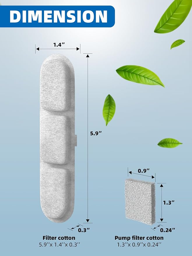 - Specification: The sponge activated carbon filter is rectangular. It is 5 in L x 1.8 in W x 0.4 in H, and it's 6 pet drinking fountain filters & 6 pump sponges in a box, it will serve you well for at least 3 months.