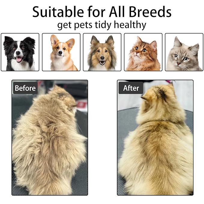 - 【Versatile & Easy to Use】:The pet grooming brush has 140° curved needles designed to make it easier to groom your pet's undercoat well. Metal button short press to change the spray speed, long press to turn on the UV light, it is a multi-functional grooming tool that combines cleaning, brushing, spraying and de-shedding