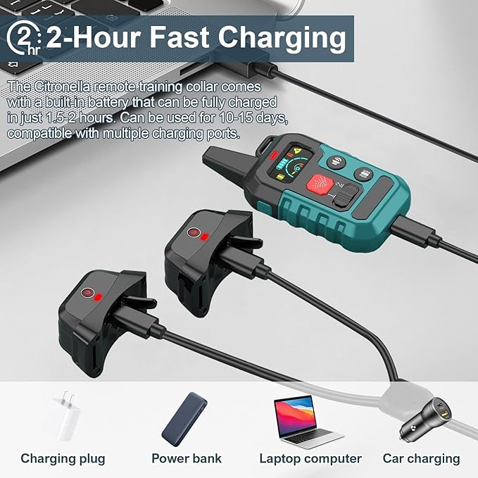 - 【Fast Charging & IPX7 Waterproof】Our Citronella remote training collar comes with a built-in battery that can be fully charged in just 1.5-2 hours. Can be used for 10-15 days, compatible with multiple charging ports. IPX7 waterproof, up to 300 meters. This means you can use our Citronella bark collar in any weather & harsh conditions. (Please note that the remote control needs to be kept away from water)