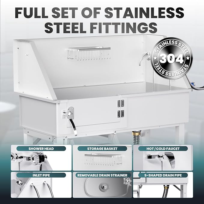 - 38" Dog Grooming Tub:Dog Washing Station for Home measures 38"x22"x42", and its spacious design can accommodate dogs of all sizes. Unlike other dog bathtubs on the market,we have upgraded the upper and lower non-slip ramps, shower heads, faucets, and hoses to ensure optimal performance. It is also equipped with a soap dispenser and a dog leash holder to make the entire bathing process more convenient for your pet and you