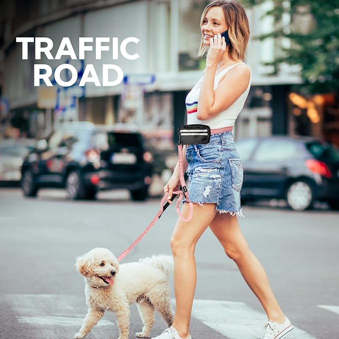 Hands Free Dog Leash, Adjustable Waist Belt with Double Padded Handles, Retractable Bungee for Medium & Large Dogs, Waist Leash for Dog Walking, Running, No Pull, Pink