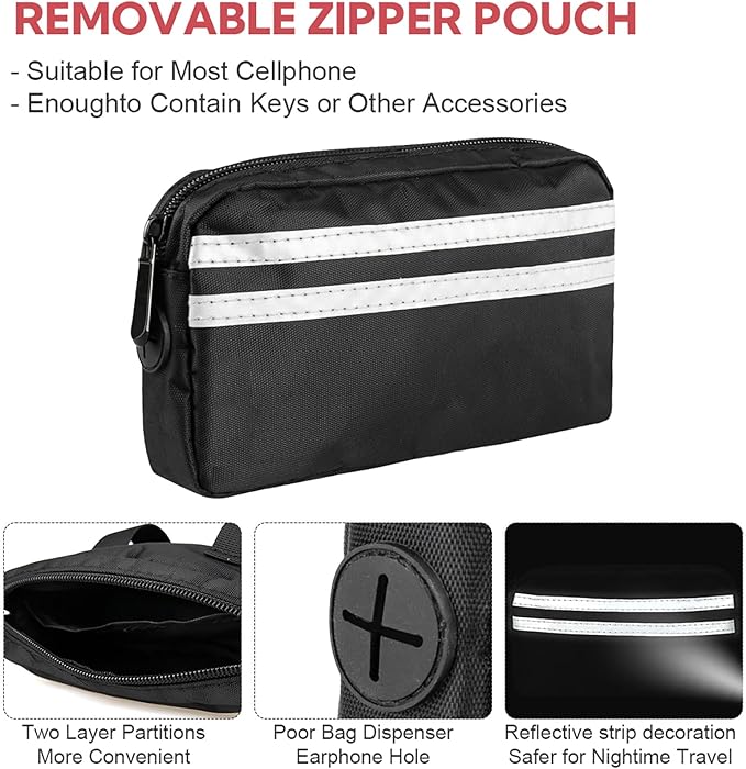 - Multifunctional Dog Training Treat Pouch: This attached bag can be used as a dog treat pouch that has perfect size,it's super nice to put your phone and house key in it while you are out about with your dogs and no bulging! Small hole on the side of the bag that can be used as a dog poop bag holder for leash and can also be used to connect headphone cables while running.Get ready to have the best time with your dog with the attached bag in a dog running leash hands free! Enjoy a hands free walking, running experience with your furry friend