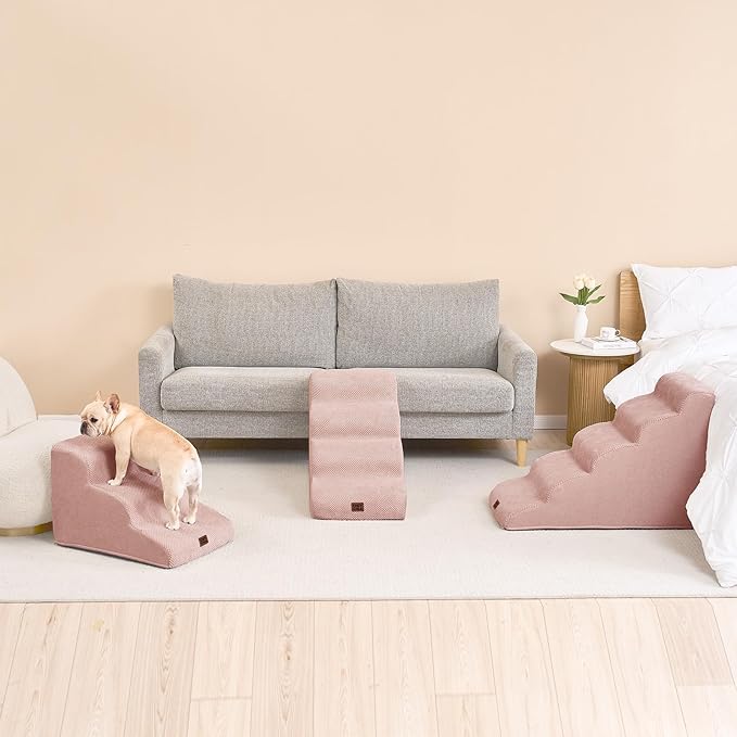 - SPECIFIC AND STEADY DESIGN - 33D density of pure foam make this stair more steady when your pets walk on. The dog bed stairs can provide strong support for pets in the walking process. Low angle slope design can better protect your pet's joints.