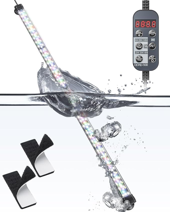 - DIY Mode: Equipped with versatile multi-color LEDs, you can specify the start time via "hour" and "minute" buttons. Additionally, enjoy 10 levels of brightness adjustment to fine-tune the lighting intensity according to your fish's growth requirements.