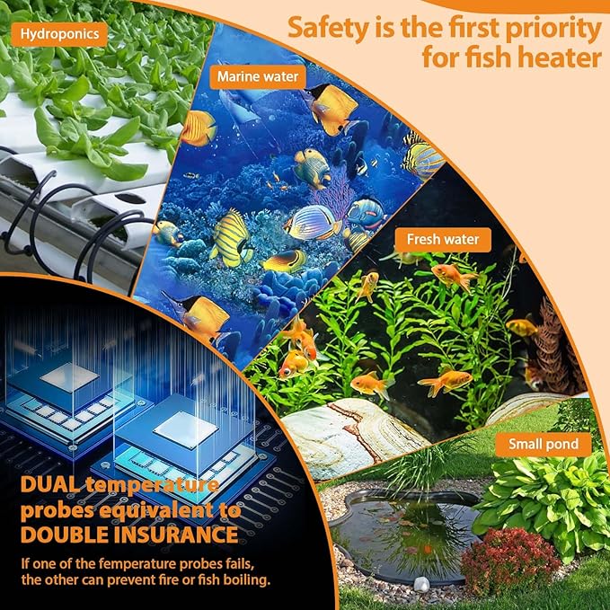 - External digital controller: Our external smart HD controller of the heater is designed with your convenience in mind, the 9.8-foot long cable cord can easily set the temperature. The temperature adjustment range is 68-93℉. The digital LED display can accurately display the real-time water temperature, allowing you to easily understand the temperature changes in the fish tank. There is also a clear heating indicator on it. No need to buy an additional thermometer, saving you money