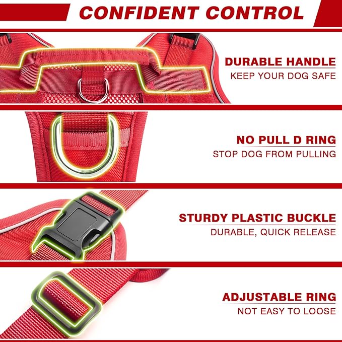 - 【4x Plastic Buckles + 2 D-rings】: Put on and take off this easy dog harness with 4 quick-release buckles from the side of the dog’s neck instead of the headwith no hassle. We also have adopted a widened design for the large dog. 2 stainless steel D-rings at the front chest and back for training, short and long leashes. This dog harness is made with military grade materials and reinforced stitching.
