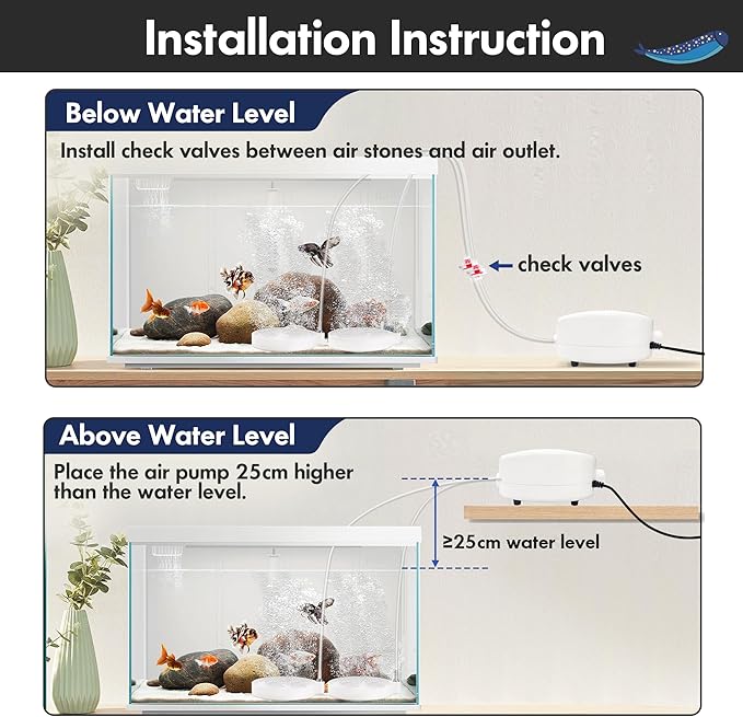- Powerful Air Pump with Adjustable Knob: 4W powerful air pump can pump air flow up to 129GPH under high air pressure through the two outlets. It can be applied to both saltwater and freshwater, providing oxygenation for aquariums and fish tanks up to 300 gallons.