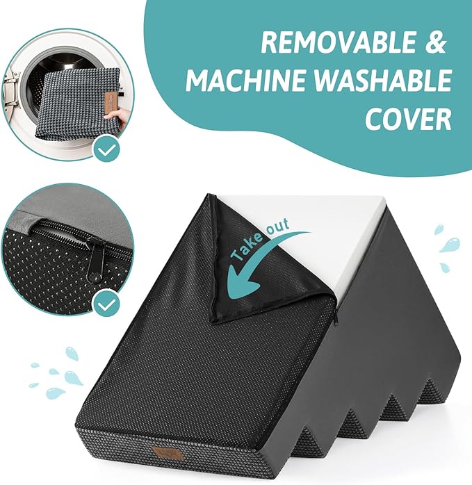 - Non-Slip Base and Removable Cover: Our dog steps for beds are equipped with a non-slip base featuring rubber dots for additional grip, minimizing movement during use. The pet steps cover is waterproof on the inner side, so you don’t have to worry about stains seeping into the foam. The outer cover is removable and machine washable for easy cleaning