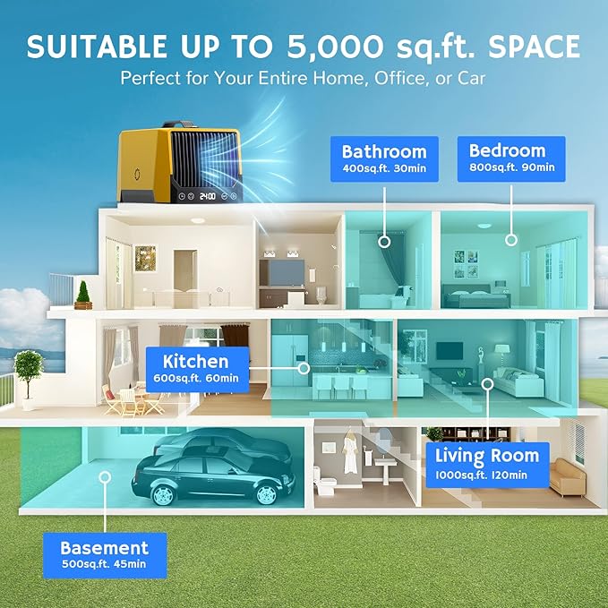 - High-Capacity: Powerful ozone generator with 5,000 sq. ft. coverage area, ideal for large rooms, homes, cars, and commercial spaces.