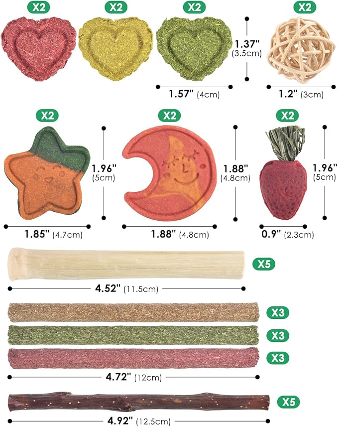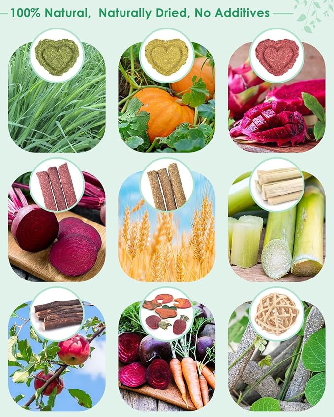 - MADE OF NATURAL MATERIALS: 33 sets of hamster chew toys are made natural apple wood, carrots, wheat, Timothy grass beets, dragon fruit, strawberries, rattan, sweet bamboo, pumpkin, papaya stems, each which is double baked to improve durability and safety, ensuring non-toxic, pigment free, hormone free products a safe chewing experience