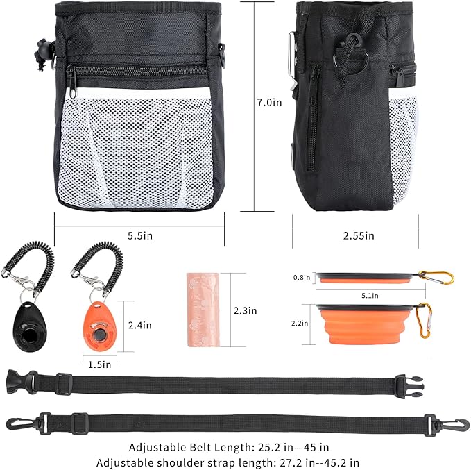 - Package Includes: The dog treat bag set contains 1 dog treat bag, 2 dog training clickers, 1 poop bag, 1 collapsible bowl, 1 adjustable waist belt, and 1 adjustable shoulder strap. It's an ideal choice for dog training, walking your dog, or traveling with your pet