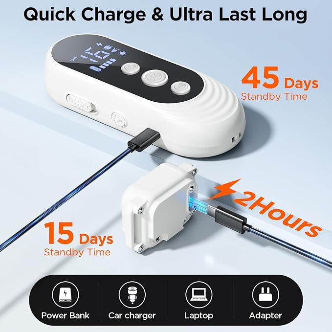 - Rechargeable & Long Battery Life: Our electronic collar adopts built-in lithium battery for charging, you can use power adapter, mobile power or laptop to charge the shock collar, which is very convenient. In addition, it only takes 2 hours to be fully charged. But when you charge it for the first time, please be sure to charge it for 4 hours. The battery life is long, the standby time of the electronic collar is up to 15 days, and the standby time of the remote control is up to 45 days!
