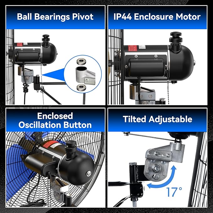 - ๐๐๐๐ฏ๐ฒ-๐๐ฎ๐ญ๐ฒ ๐๐ญ๐ซ๐ฎ๐๐ญ๐ฎ๐ซ๐ - Oscillating fan is sturdy and durable. OSHA compliant grille ensures safety, powder coating for excellent corrosion resistance, ball bearing pivot, equipped with wall mount, metal gear and aluminum blades enhance wind output. Rust-resistant grille ensures long-term safe and worry-free use while easy to clean and maintain.Extra long 6 feet + SIT waterproof power cord, 1/10 HP, 120V, 220 Watts, 60 Hz. UL safety certification