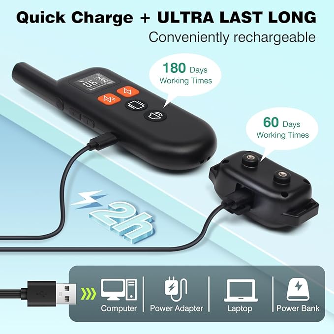 - 【Long Battery Life & Quick Charge】: Get up to 180 days standby for the collar and 60 days for the remote. Our 2 dog zapper collar with remote 2 pack charges fully in just 2 hours. This efficiency is a key benefit for those considering an e collar for dogs training set of 2
