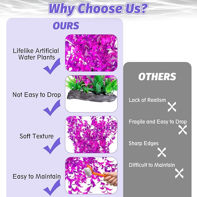 - RELIABLE MATERIAL OF FISH TANK DECORATIONS : Our fake water plant leaves and roots are made of soft plastic material that won't affect the water quality. The leaves do not have sharp edges and have a soft texture, which can effectively avoid any physical damage to the fish while swimming or playing, and aquarium decor can better beautify the e-nvironment, fish tank plants maintain stability and not fade. Fake aquarium plants provide a comfortable and clean living e-nvironment for fish. Whether placed in a saltwater e-nvironment or freshwater e-nvironment, aquarium plants plastic realistic can be perfectly adapted