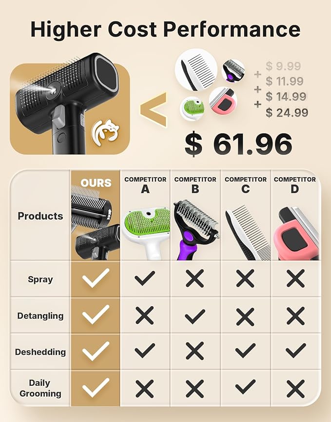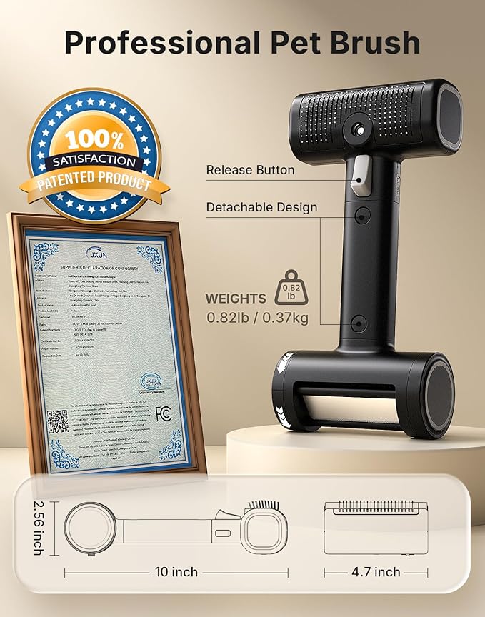 - [Pet-friendly Steam Brush] The steam brush part uses thicker bristles with soft plastic tips, creating a comfortable feeling while deshedding without hurting your pet. What's more, the spray of the brush comes out with extremely low noise (about 46 dB), which means your pets will not be afraid of the brush. The thicker and intensive bristles could also effectively capture enough floating hair. And the spay function could last about 1 hour after charging. Happy and effective grooming for pets