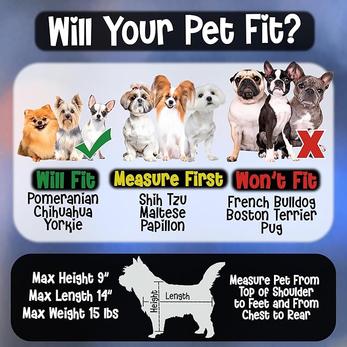 - [Max Weight 15 lbs] Maximum pet dimensions 9 inches tall 14 inches long and 15 lbs. This is a carrier for small dogs or cats if your pet is larger it will be a tight fit.