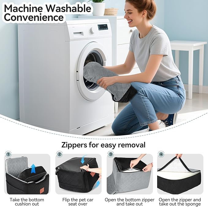 - Detachable and Washable:This pet car seat is very easy to clean,with its fully detachable design.The dog bed has a built-in sliding zipper, just remove all the foam, and then machine wash the seat covers.The bottom of the booster seat is waterproof, protection against accidents. Please note that the inner foam is not washable.