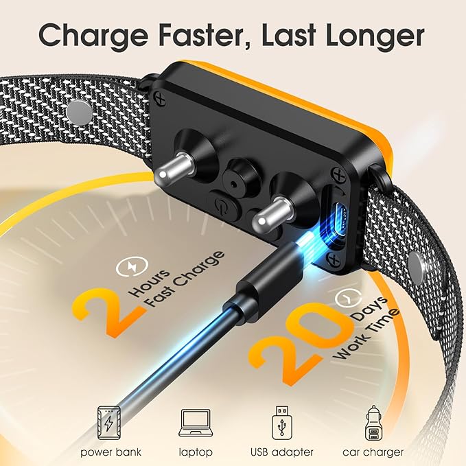 - 【Fast Charging & Waterproof】 With just a 2-hour quick charge using the included Type-C cable (compatible with your phone charger or power bank), the KJKZO bark collar for medium dogs lasts an incredible 20-30 days. The IP65 waterproof rating means your water-loving pup can swim, play in the rain, or shake off after a bath without any issues, making it an ideal dog bark collar. Freedom for them, peace of mind for you!
