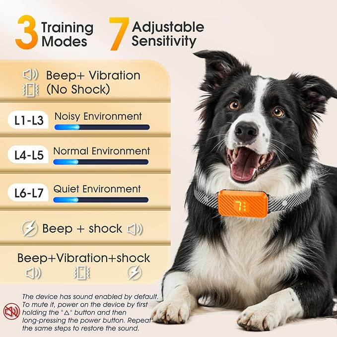 - 【3+7 Customizable Training Modes】 Every dog is unique, and so are their training needs. That's why this no bark collar for small dogs or for ferocious large dogs has been designed with 3 customizable modes (beep+vibration and other combinations) and 7 sensitivity levels. Whether it's late-night apartment living or daytime backyard play, you can easily adjust this stop bark collar's settings for optimal results. It's like having a professional dog trainer available 24/7!