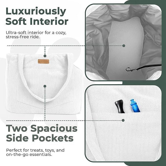 Corduroy Dog Carrier - Lightweight Cotton Soft-Sided Pet Tote with Safety Harness Clip - Breathable Travel Carrier for Small Dogs and Puppies (White)