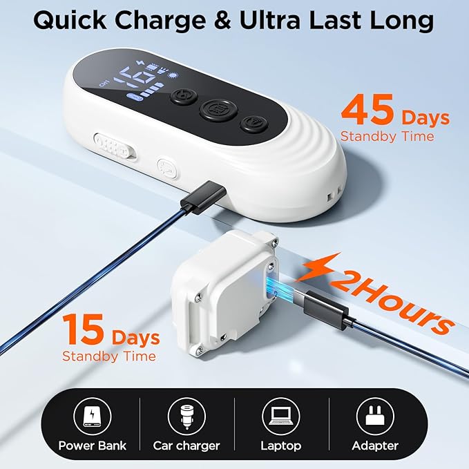 - Rechargeable & Long Battery Life: Our electronic collar adopts built-in lithium battery for charging, you can use power adapter, mobile power or laptop to charge the shock collar, which is very convenient. In addition, it only takes 2 hours to be fully charged. But when you charge it for the first time, please be sure to charge it for 4 hours. The battery life is long, the standby time of the electronic collar is up to 15 days, and the standby time of the remote control is up to 45 days!