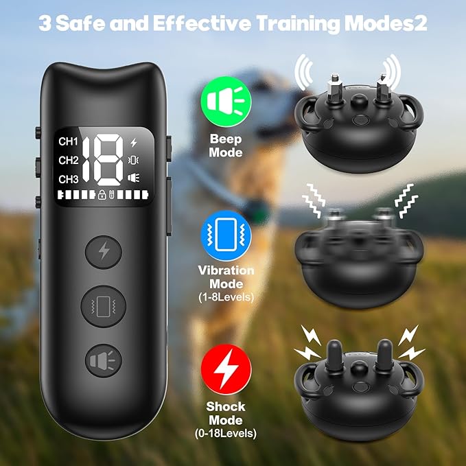 - 3 Training Modes: This dog shock collar with remote control offers beep, vibration (1-8 levels), and shock (0-18 levels) modes. Start low and adjust as needed. The remote controls up to 3 collars at once, making it easy to train multiple dogs and correct behaviors effectively