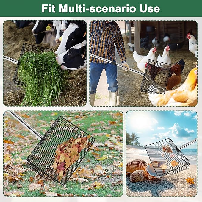 - ๐ [Widly Use Extra-wide Sifter Shovel] This chicken coop sifting shovel can be used for large-scale cleaning work, It can also be used as aleaf cleaning shovel, beach sand shovel, horse/cow/sheep poop scooper, etc. Whether you are using it for a small backyard or a large farm, this sand sifter shovel will do the job.