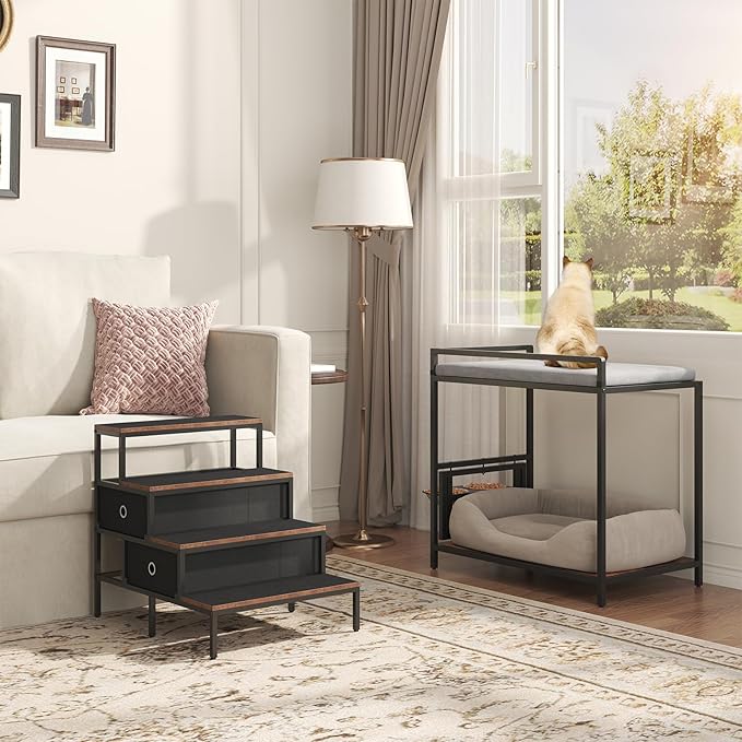 - SMART MULTI-FUNCTIONAL DESIGN: The dog window perch with stairs offers a cozy top sleeping space with a cushion and a versatile bottom area – perfect for creating a second pet sleeping nook or storing toys. Allows two pets to enjoy the space simultaneously. Plus, the stairs include two upgraded, spacious storage drawers.