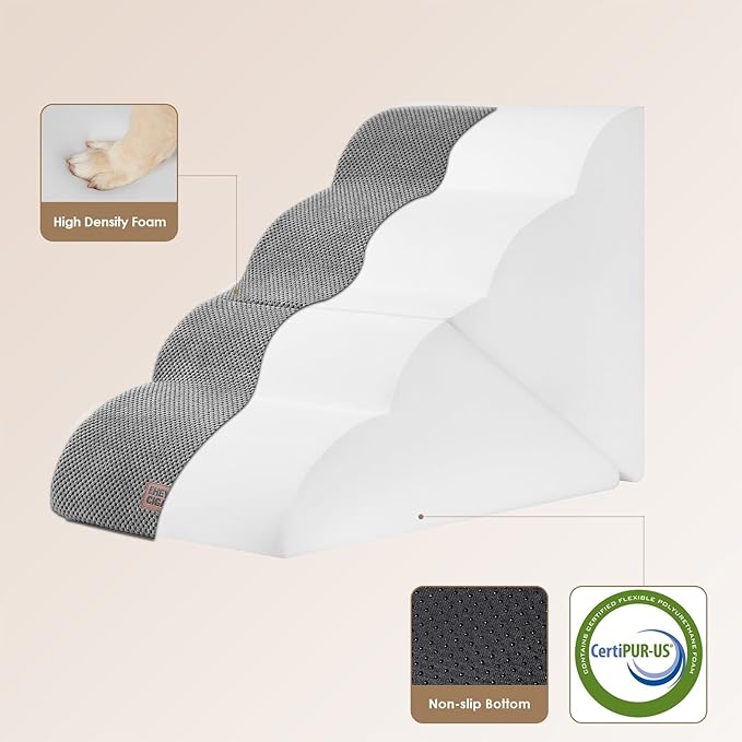 - SPECIFIC AND STEADY DESIGN - 33D density of pure foam make this stair more steady when your pets walk on. The dog bed stairs can provide strong support for pets in the walking process. Low angle slope design can better protect your pet's joints.