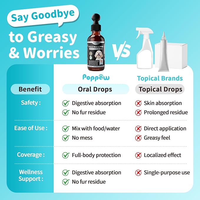 - Skin & Gut Support Drops: POPPAW flea and tick support drops combine leinseed oil microcapsule powder, biotin, and water-soluble coconut oil to nourish your dog’s skin and coat from within. Enhanced with apple cider vinegar powder, plus a soothing chamomile-turmeric blend to calm skin and gut sensitivity. Powered by black pepper extract to maximize absorption of every active ingredient—providing a full-spectrum care for your pets.