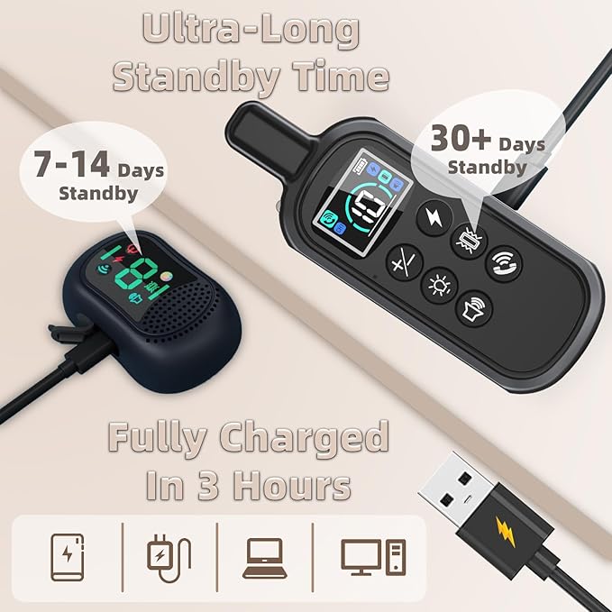 - [Rechargeable Dog Training Collar]: The dog e collar can be quickly recharged within 2 hours, the remote control can be used for about 30 days and the receiver can be used for about 10-30 days, which ensures that the training process is continuous.