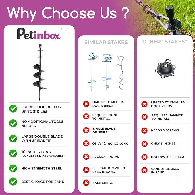 - HOLDS FIRM ON VARIED TERRAIN – Designed to grip in sand, soil, or clay without loosening. Unlike flimsy stakes, our upgraded spiral blades reduce wobbling and resist pulling, even with active dogs.