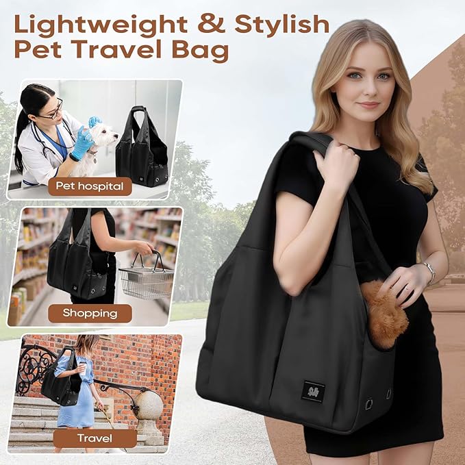 Dog Purse Carrier for Small Dogs, Cats, and Puppies – Soft-Sided Travel Pet Tote Bag with 4 Large Pockets, Foldable, Lightweight, Fits Pets up to 15 lbs, for Travel, Outings (Black)